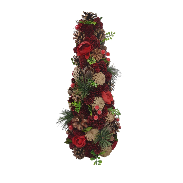 Composta por pinhas, folhagens, flores vermelhas e detalhes verdes, ela traz textura, cor e um toque artesanal à decoração.