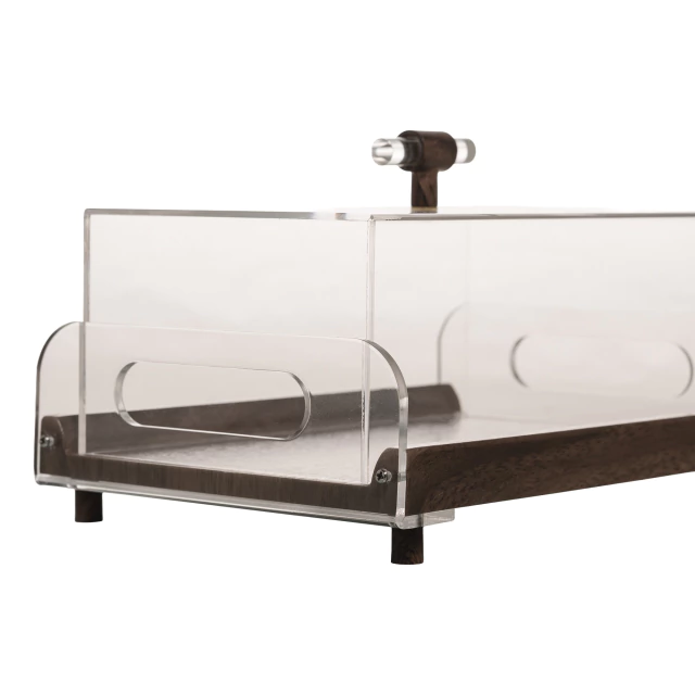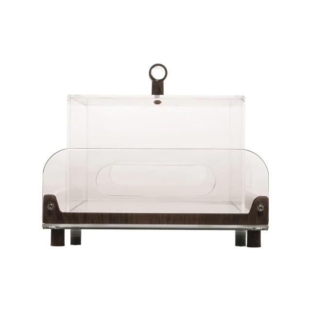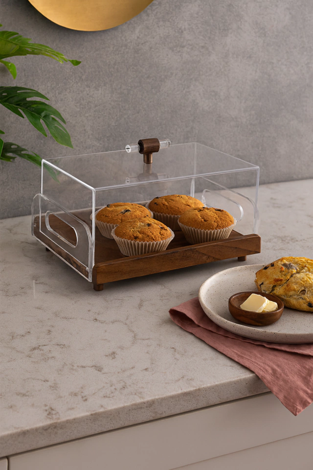 Com base em madeira natural e cúpula em acrílico transparente, protege e valoriza bolos, pães e doces, mantendo a beleza e o frescor dos alimentos.