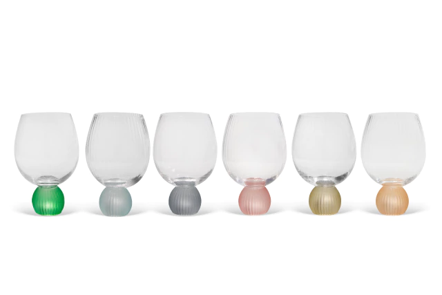 Com corpo em vidro transparente e base em formato de esfera colorida, as peças combinam elegância e criatividade, tornando qualquer ocasião mais charmosa e especial.