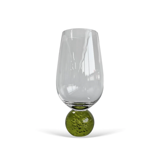 Com corpo em vidro transparente e base esférica verde, ele traz um toque contemporâneo e vibrante à mesa, ideal para receber com estilo.