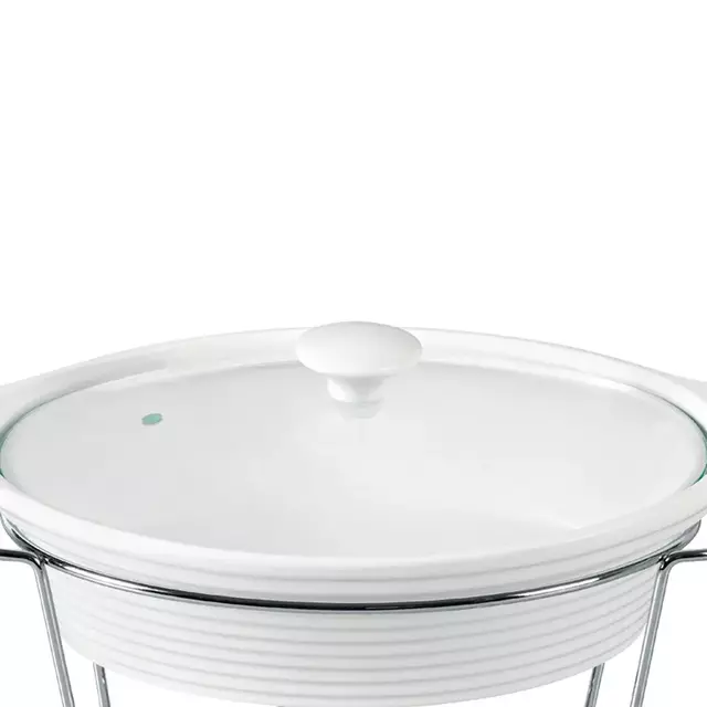 Ideal para servir com praticidade e elegância, o rechaud oval em cerâmica com queimador é perfeito para manter os alimentos aquecidos durante refeições em família, eventos ou ocasiões especiais. Une funcionalidade, resistência e um design sofisticado que valoriza a apresentação dos pratos à mesa.